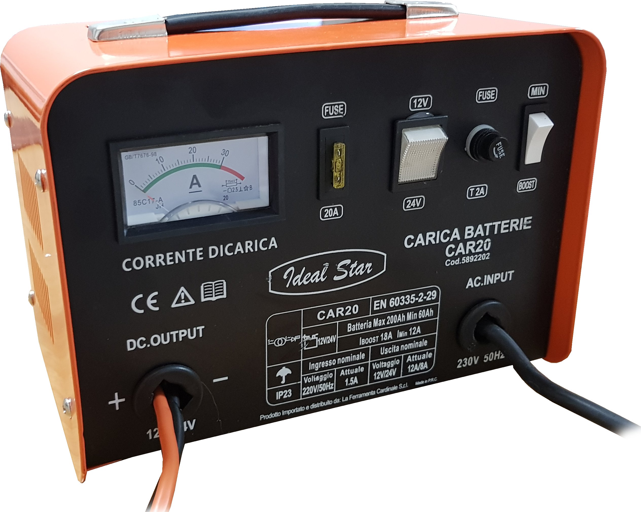 Caricabatteria portatile per la ricarica di batterie al piombo 12V / 24V. Protetto contro il sovraccarico. Attrezzatura con selettore per carica normale o rapida (boost) (carica minima o massima) Attrezzatura con amperometro, che indica in ogni momento l'avanzamento della carica. Compatto, leggero e portatile. Adatto per auto, furgoni e autocarri leggeri. Fornito con kit completo. Tensione di ingresso 230V. Frequenza 50/60Hz. Potenza di ingresso (W) 300. Voltaggio di carica (V) 12/24. Capacita' carica batterie (AH) 60-200. Peso (Kg) 6. Dimensione (cm) L35xP16xH18.