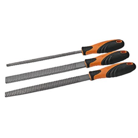 Impugnatura ergonomica bi-materiale. Contenuto: 1 raspa piatta, 1 raspa mezza tonda, 1 raspa tonda.