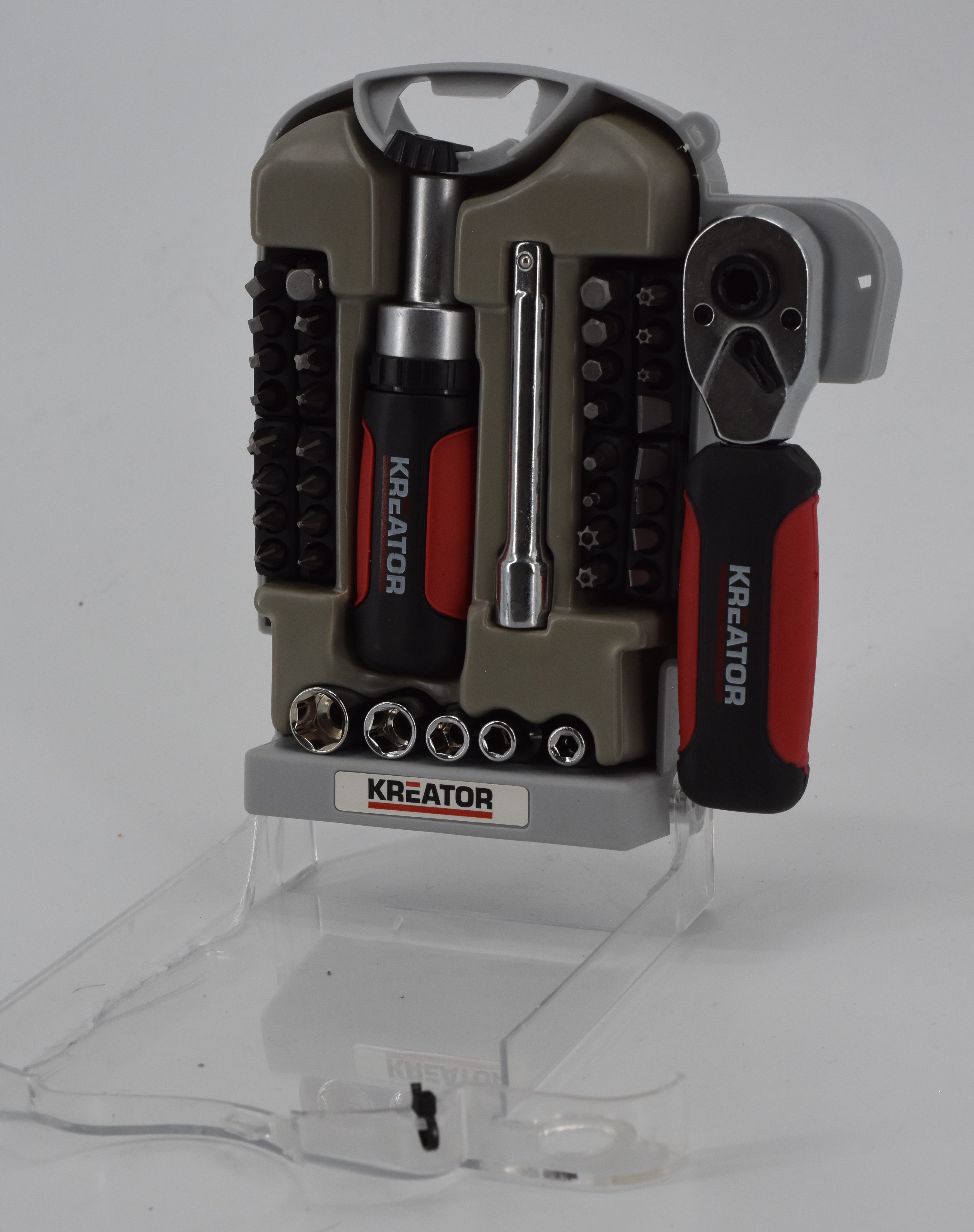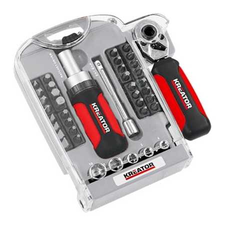 Pratica valigetta in plastica con sportello. Contenuto: Impugnatura a cricco, 5 Bussole 1/4" (4/5/6/8/10 mm), prolunga 75 mm con attacco 1/4", 32 inserti (PH0, PH1, PH2, PH3, Taglio 3/4/5/6/7 mm, PZ1, PZ2, PZ3, Esagonale 2/2,5/3/4/5/6, Torx T10/T15/T20/T25/T27/T30, R0, R1, R2, R3).