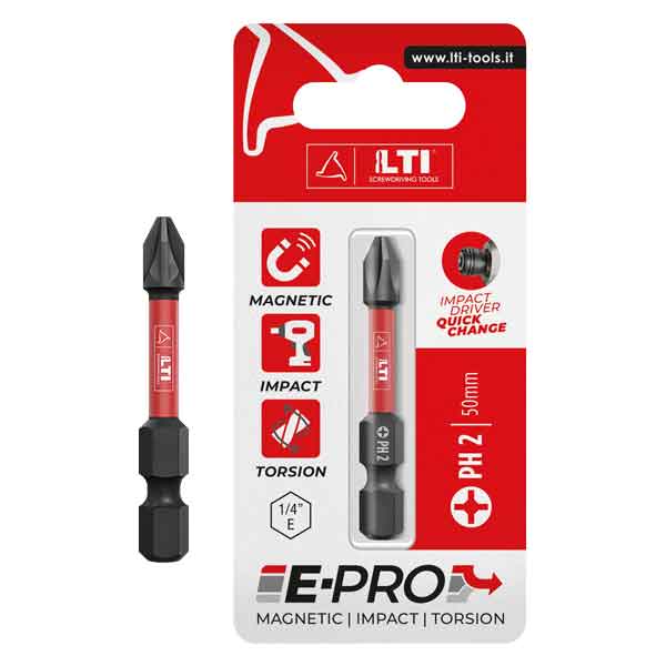 In acciaio S2 ad alta resistenza. Durezza 60HRC. Attacco 1/4". Lunghezza 50 mm. Per avvitatori manuali, elettrici e pneumatici. In blister da 1 pezzo.