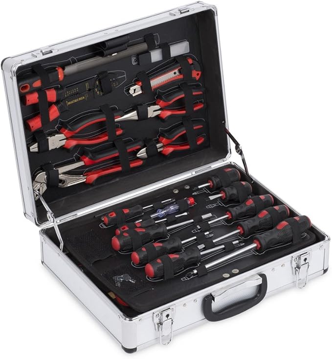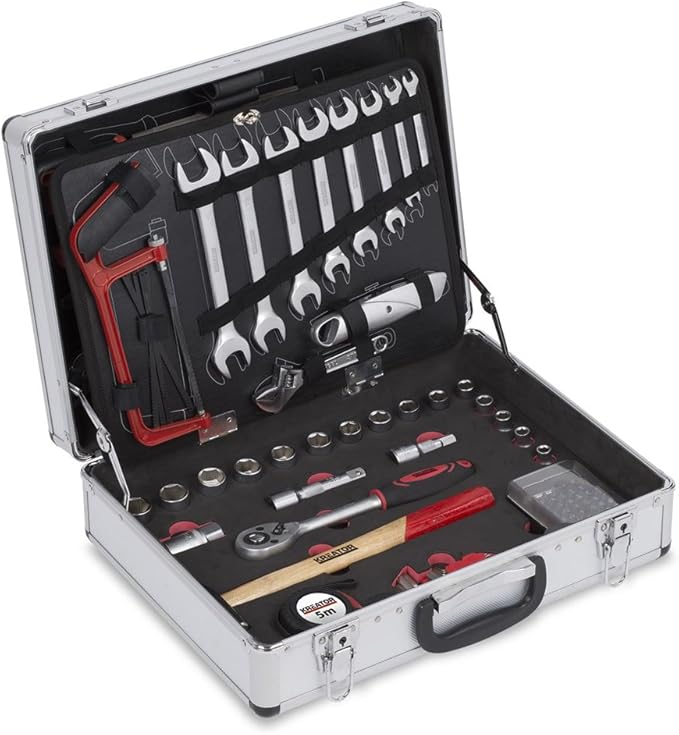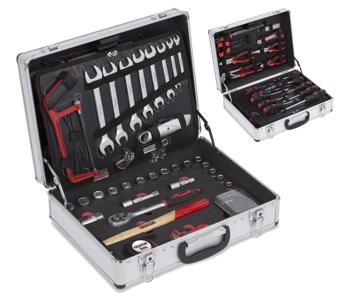 Contenuto: 15 chiavi a bussola 1/2" (mm 8÷22), 1 chiave a bussola per candele mm 21, 9 chiavi esagonali (mm 1,5÷10), 3 cacciaviti a taglio (mm 5/6/8), 2 cacciaviti a croce (PH1/PH2), 1 cacciavite a taglio nano mm 6x38, 1 cacciavite a croce nano PH2x38, 2 cacciaviti di precisione a taglio + croce, 1 cacciavite cercafase mm 140, 9 inserti a taglio (1 pz x mm 3, 2 pz x mm 4/5/6/7), 8 inserti a croce (2 pz x PH0/PH1/PH2/PH3), 8 inserti Pozidriv (2 pz x PZ0/PZ1/PZ2/PZ3), 7 inserti esagonale (mm 2/2,5/3/4/5/5,5/6), 6 inserti Torx (T10/T15/ T20/T25/T27/T30), 4 inserti punta quadra (0/1/2/3), 1 mandrino attacco rapido mm 60, 1 lima piatta mm 200, 3 lame per cutter mm 18, 1 cutter mm 18, 1 cutter lama trapezoidale, 1 pinza per capicorda, 1 pinza universale mm 200, 1 pinza poligrip mm 250, 1 pinza becchi lunghi mm 200, 1 tronchese mm 160, 1 seghetto per ferro mm 150 + 6 lame per ferro mm 150, 8 chiavi combinate (mm 6x7÷20x22), 1 chiave a rullino mm 150, 1 martello gr. 300, 1 cricchetto attacco 1/2", 2 prolunghe attacco 1/2" (mm 75-125), 1 flessometro mt. 5, valigia in alluminio.