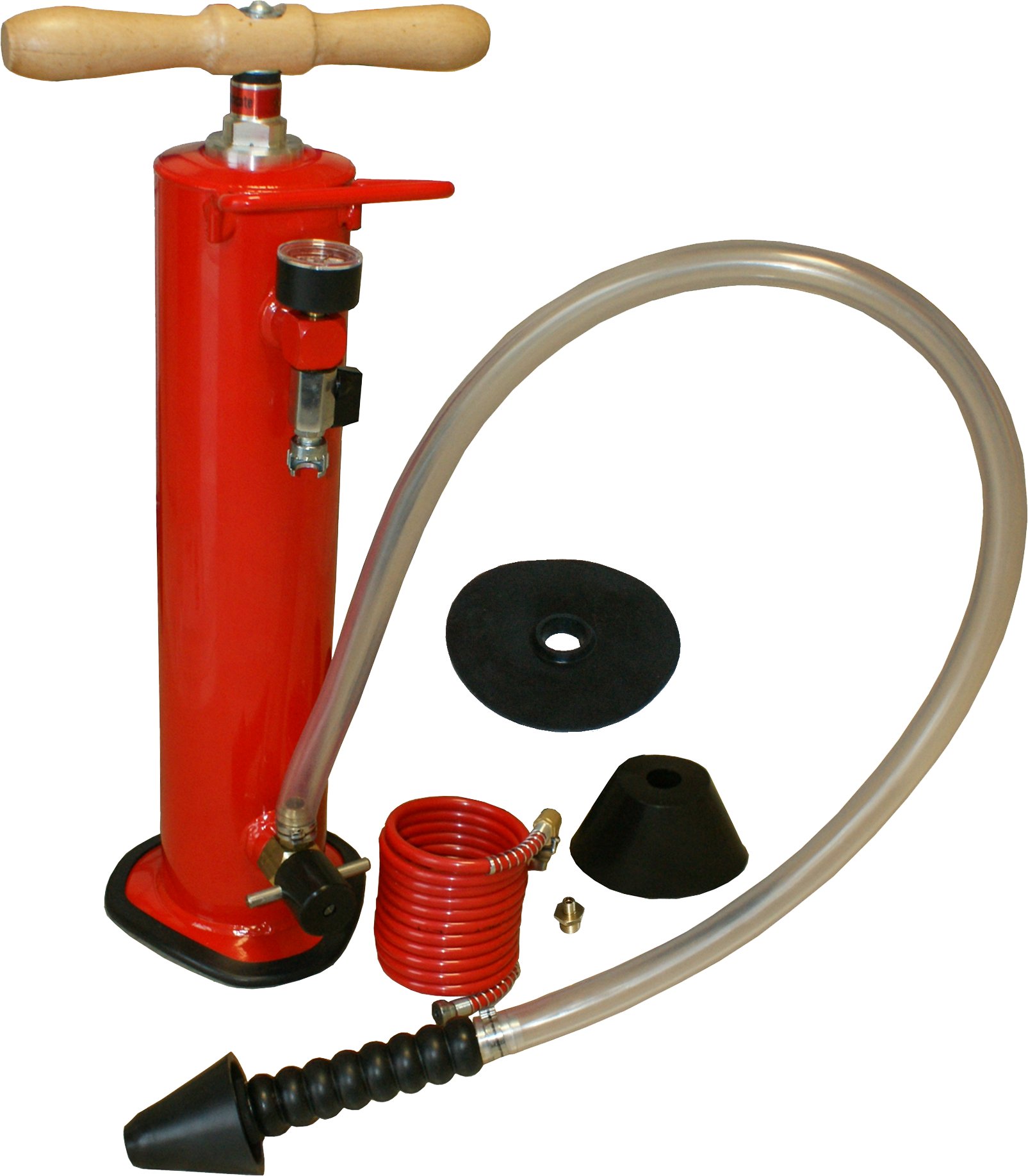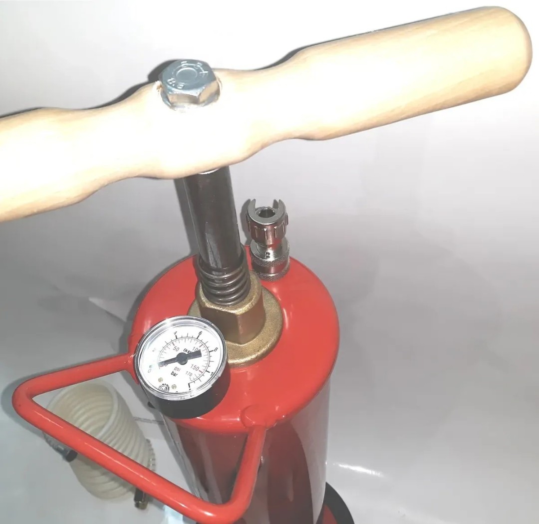A pressione d'aria per sturare tubazioni, collaudo impianti e caricare vasi d'espansione. Completa di manometro, tubo in gomma con cono e 2 accessori protettivi, tubo spiralato per caricare i vasi d'espansione per tubi sino 1"1/2.