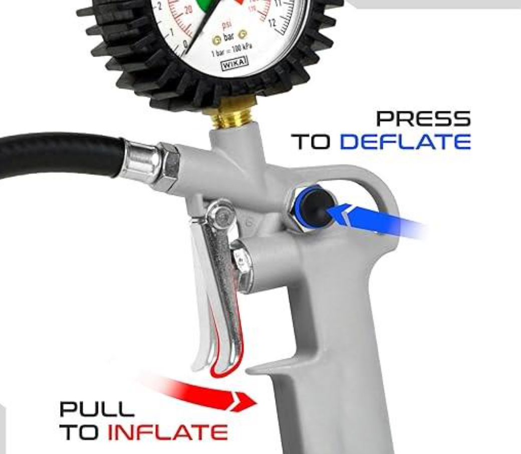 In alluminio, con manometro Ø 60 mm pressione 0-12 bar. Dotato di due raccordi per attacco sia rapido che a baionetta