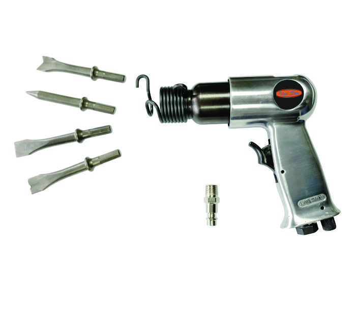 Martello pneumatico da 150 mm (set 7 pezzi). Consumo aria media: 141,6l/min. Pressione d'esercizio: 6 bar. Colpi al minuto: 4500 colpi/min. Peso: 1,1Kg. Il kit include: 1 martello pneumatico, 4 scalpelli pneumatici, 1 attacco rapido pneumatico, 1 molla.