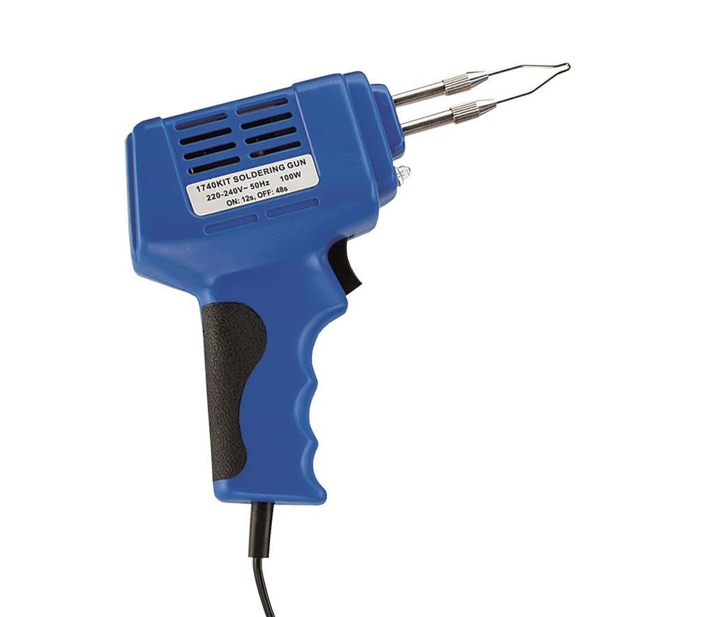 Saldatore elettrico a pistola istantaneo pronto per l’uso. Impugnatura ergonomica. Alimentazione 220 Volt. Ideale per lavori di stagnatura e brasatura di circuiti elettrici. Punta di ricambio inclusa nella confezione.