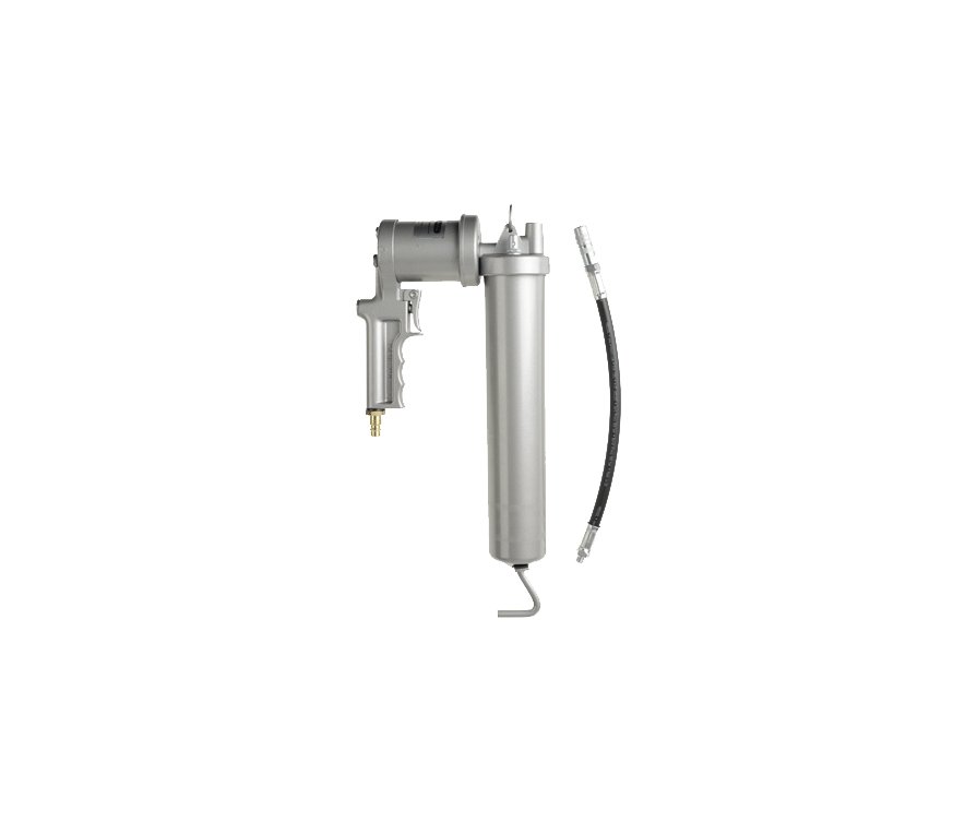 Avanzamento del grasso nel tubo stantuffo mediante molla. Pressione aria 2÷8 bar. Possibilità di riempimento sia con grasso sfuso che in cartuccia. Fornito con tubo flessibile ad alta pressione mm.300 M10x1, testina idraulica 4 griffe.