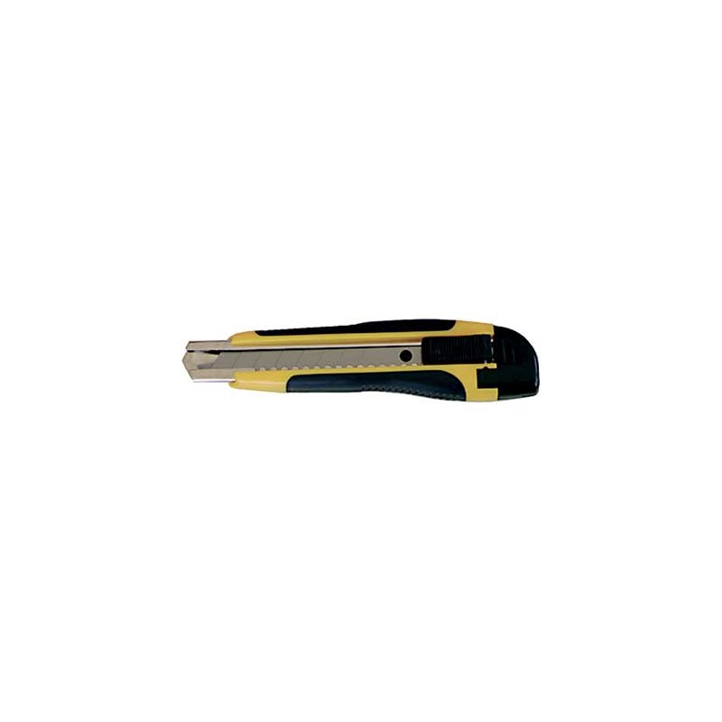 Corpo metallico rivestito in ABS. Guida lama metallica. Impugnatura con particolari antiscivolo. Fermo lama a cursore con blocco di sicurezza.