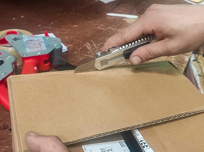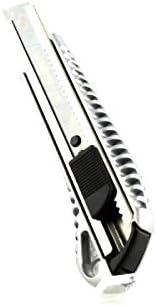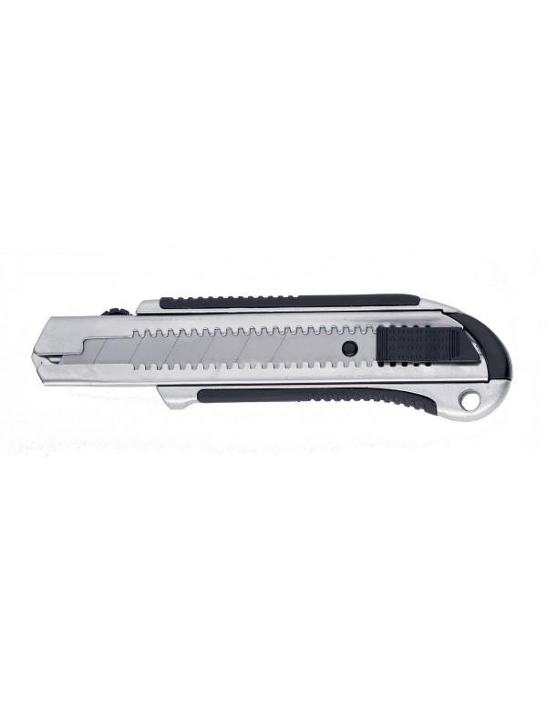 Corpo in lega. Guida di scorrimento della lama in acciaio cromato. Zigrinatura antiscivolo sul corpo. Cursore autobloccante.