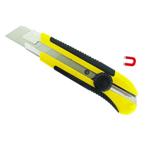 Cutter professionale con lama sezione mm 25x0,7. Guida lama in metallo. Dotato di pratica rotella per il bloccaggio della lama. Rivestimento antiscivolo. Dotato di un magnete raccoglilame. In dotazione due lame di ricambio incorporate.