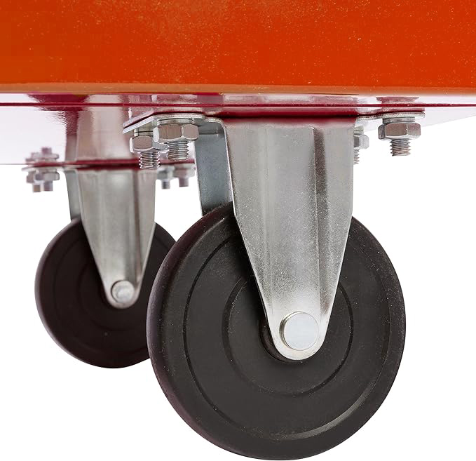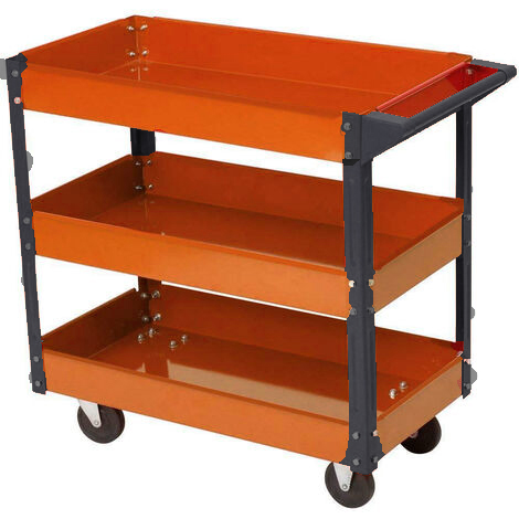 Carrello porta utensili con struttura robusta in acciaio verniciato colore arancione con 3 ripiani ampi e maniglione superiore per spostarlo con massima facilità. Spessore acciaio mm 0.8. Carrello completo di 4 ruote di cui 2 fisse e 2 pivotanti con blocco, ottimo da avere nell'officina per avere sempre in ordine e a portata di mano i vari attrezzi che ti servono. Dimensioni ripiani (LxPxH): 70x35x7 cm. Dimensioni maniglia (LxP): 70x8 cm.