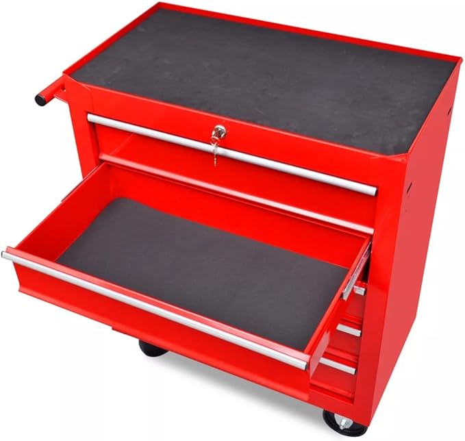 5 Ampi cassetti. Materiale: Acciaio. Verniciatura a polvere. Dotato di 4 ruote diam.75mm. 2 Ruote fisse e 2 girevoli. Comoda maniglia per un facile spostamento. Chiusura con chiave. Dimensioni : L 62 x P 33 x H 75 cm. Dimensioni piano appoggio: L 61 x P 32,5 cm, con tappetino antiscivolo. Dimensioni interne cassetto: L 51 x P 26 x H 10 cm