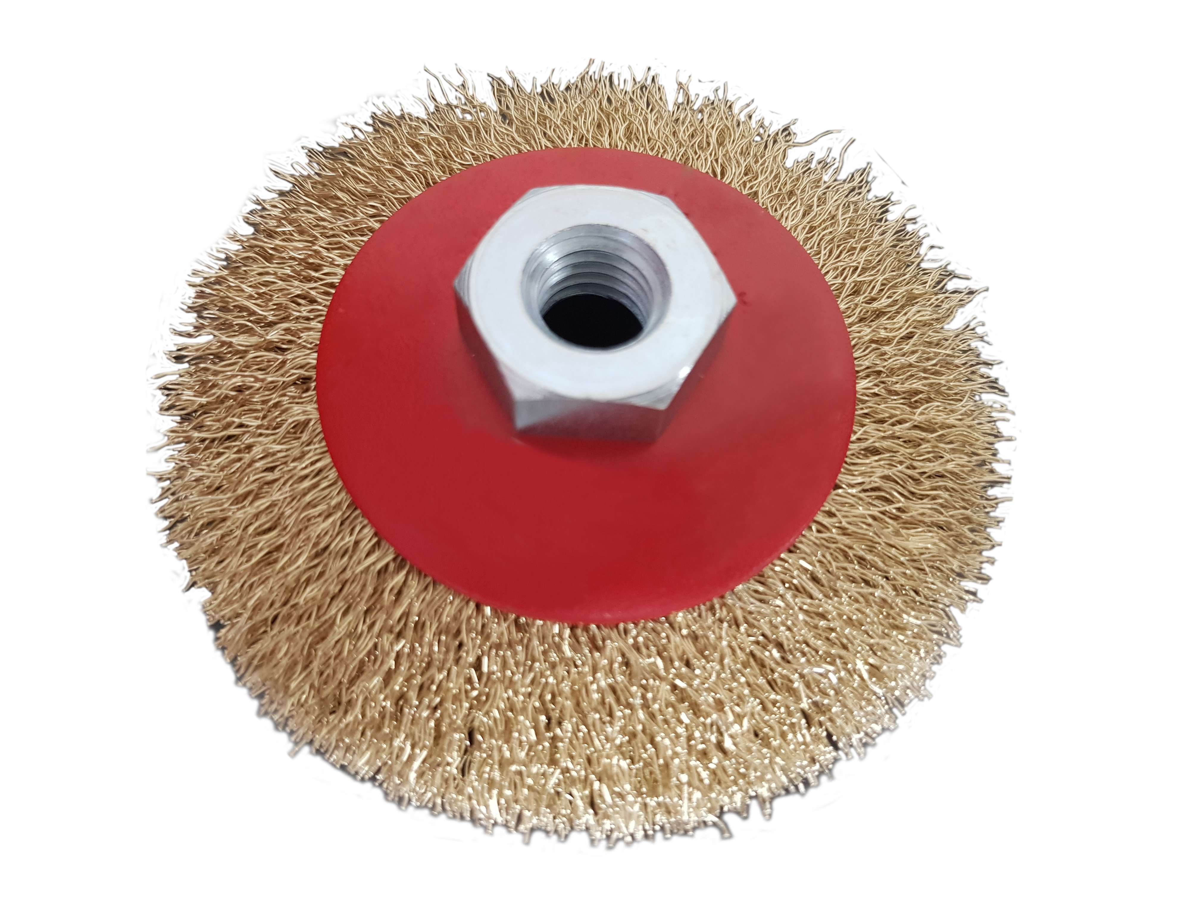 Filamenti in acciaio ottonato ondulato. Foro M14. Per utilizzo su smerigliatrici portatili, sia elettriche sia ad aria compressa, per lavori di rimozione scorie, ruggine e residui da superfici di ogni materiale e forma.