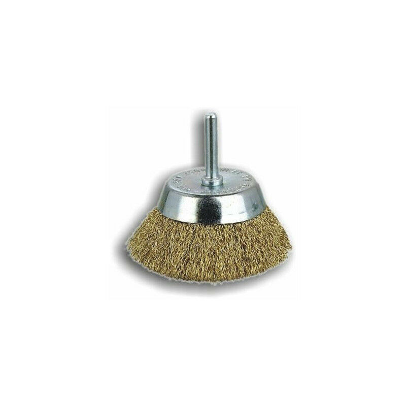 Filamenti in acciaio ottonato ondulato. Gambo Ø mm.6x25. Per un utilizzo prevalente su utensili portatili ad alta velocità di rotazione, per lavori di abrasione frontale e pulitura di superfici.