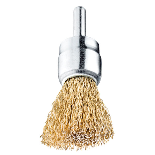 Filamenti in acciaio ottonato ondulato. Gambo Ø mm.6x25. Per un utilizzo prevalente su utensili portatili ad alta velocità di rotazione, per lavori di abrasione frontale e pulitura di superfici.