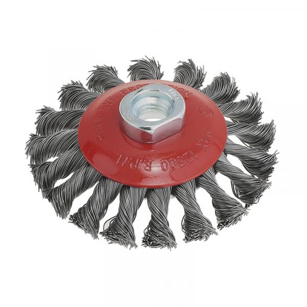 Filamenti in acciaio a mazzetti ritorti. Foro M14. Per utilizzo su smerigliatrici portatili, sia elettriche sia ad aria compressa, per lavori di rimozione scorie, ruggine e residui da superfici di ogni materiale e forma.