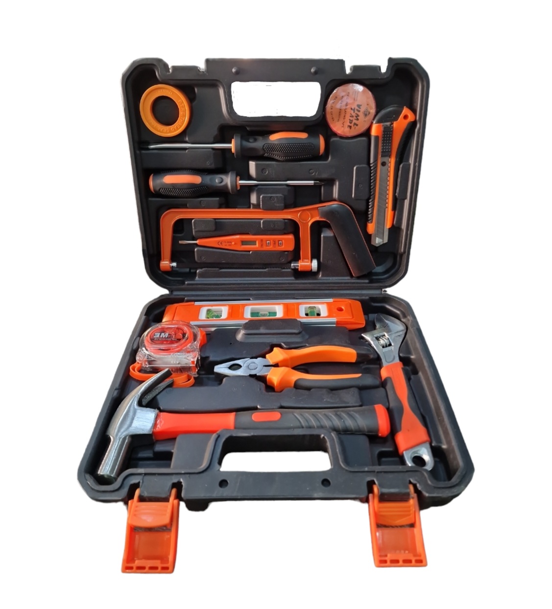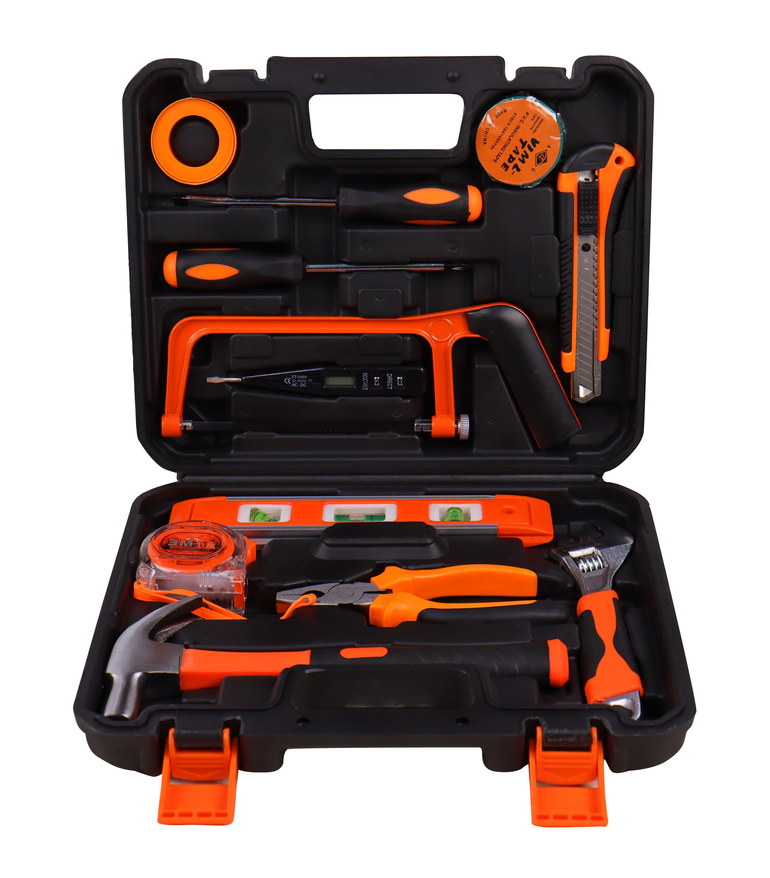 Il set comprende: 1 rotolo di nastro teflon, 1 cacciavite a taglio, 1 cacciavite a croce, 1 rotolo di nastro adesivo, 1 cutter manico gomma, 1 mini sega, 1 cercafase digitale, 1 livello, 1 flessometro 3 mt, 1 pinza da 150 mm, 1 chiave regolabile 200 mm, 1 martello, 1 cassetta in plastica.