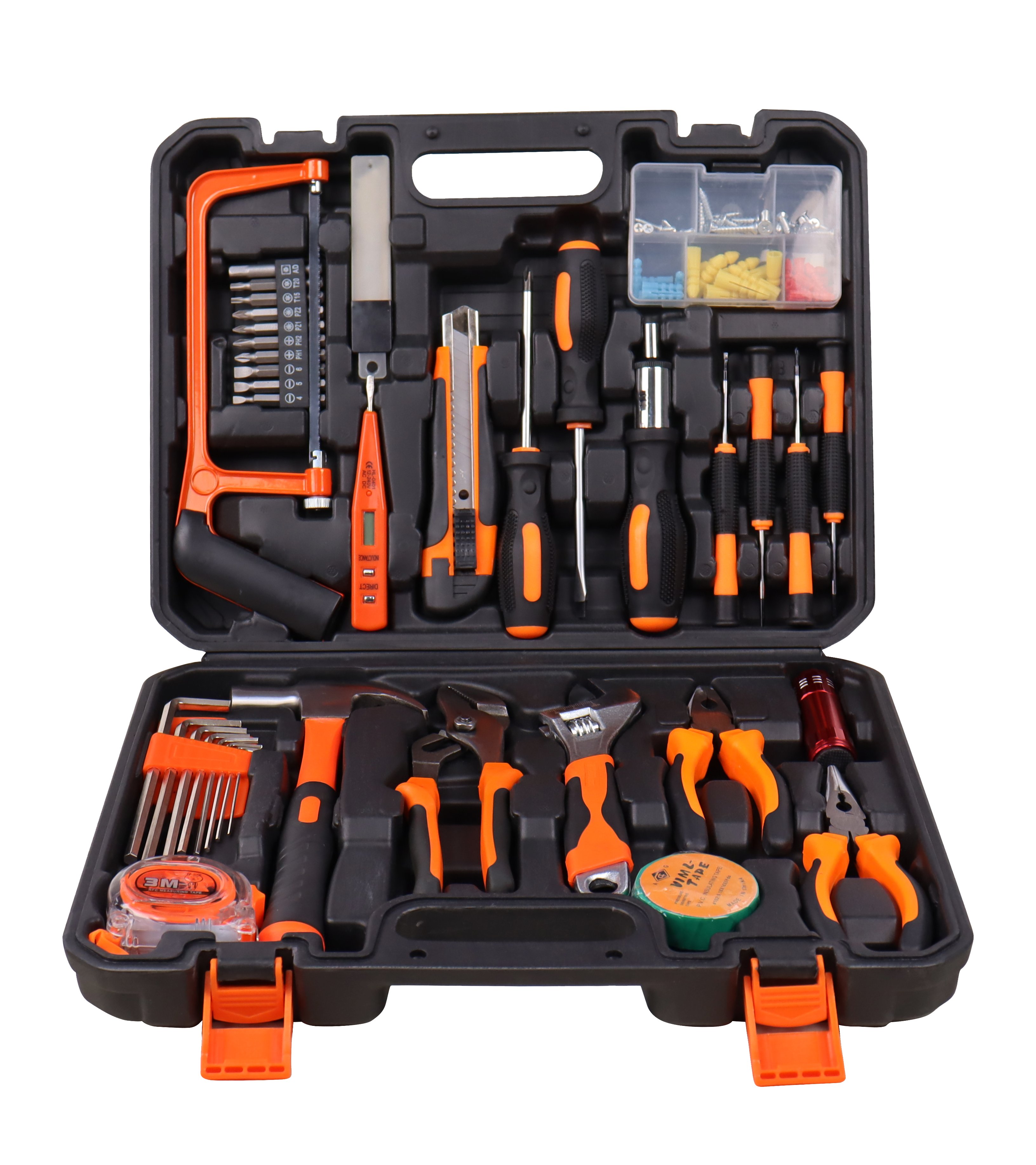 Il set comprende: 1 mini sega 150mm, 60 viti e tasselli, 1 martello, 1 cercafase digitale, 1 cutter manico gomma, 5 lame per taglierino, 1 cacciavite a cricchetto con impugnatura morbida, 10 inserti da 50mm, 8 chiavi esagonali lunghe 1.5-2-2.5-3-4-5-5.5-6, 1 torcia, 1 nastro isolante, 1 flessometro da 3 mt, 4 cacciaviti di precisione, 1 Pinza poligrip 150mm, 1 Chiave regolabile da 200mm, 1 Pinza 150mm, 1 Pinza becchi lunghi 150mm, 1 Cacciavite a croce, 1 Cacciavite a taglio, 1 Valigetta in plastica.