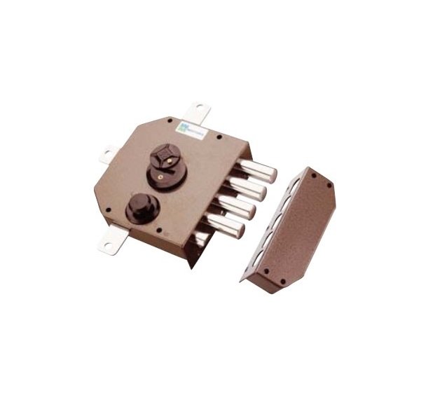 Triplice con mezzo giro, apertura interna con chiave, 4 mandate, corsa chiavistelli mm.40, corsa aste mm.17. Scatola verniciata mm.132x146x30.