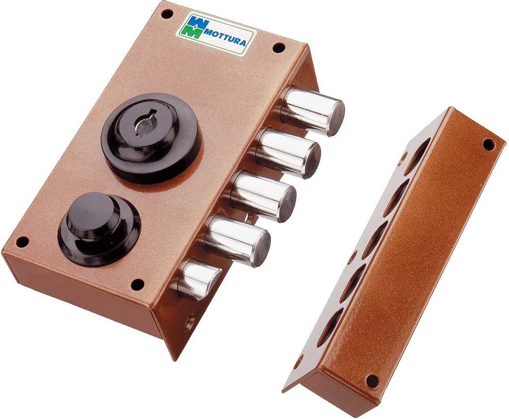 Laterale con mezzo giro, apertura interna con chiave, pompa-cilindro Ø 30 esterna lunghezza mm.60, corsa chiavistelli mm.24. Scatola verniciata bronzo mm.80x152x30.
