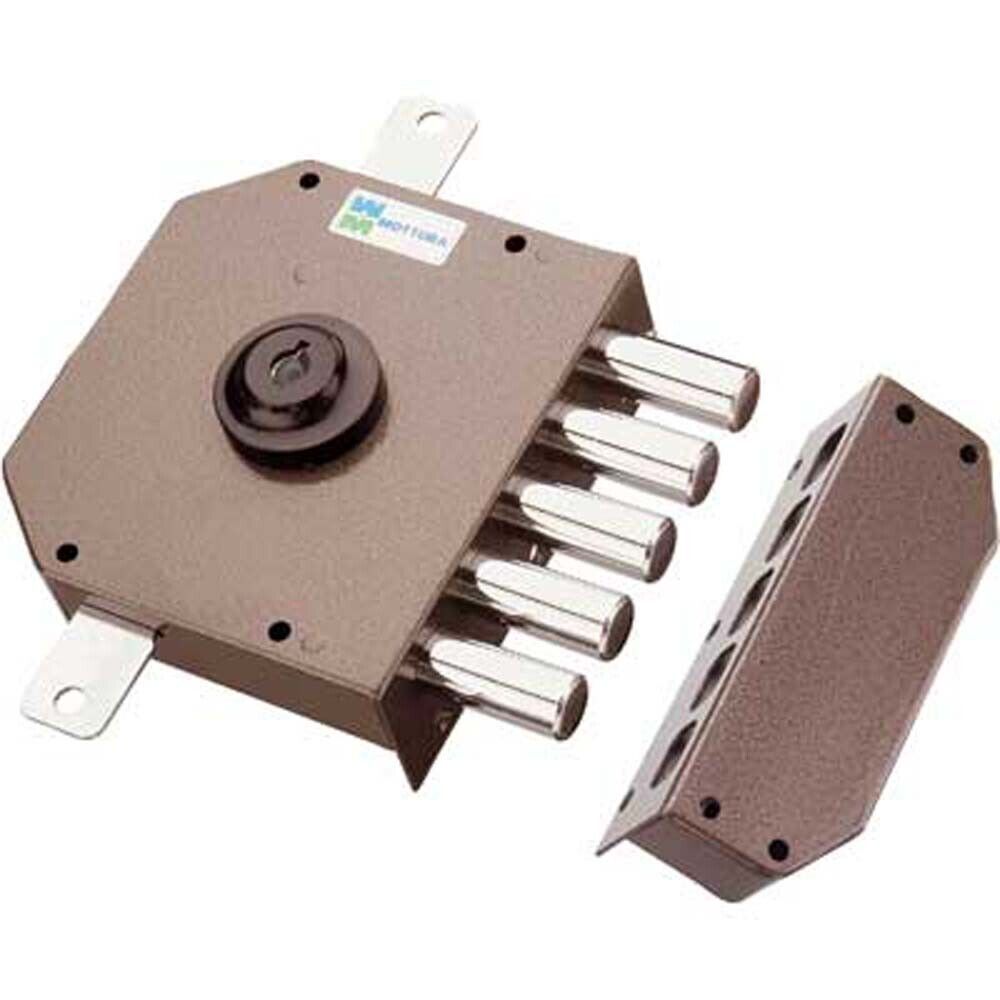 Triplice, apertura interna con chiave, pompa-cilindro Ø 30 esterna lunghezza mm.60, corsa chiavistelli mm.40, corsa aste mm.17. Scatola verniciata mm.132x146x30.
