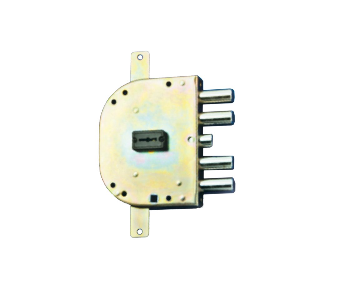 Doppia mappa, chiusura triplice, scrocco comandato dalla chiave e dal quadro maniglia. 4 catenacci, corsa mm.38. Scatola zincata mm.164x130x32. In dotazione n° 3 chiavi fisse mm.116 e 1 da cantiere. A planare.