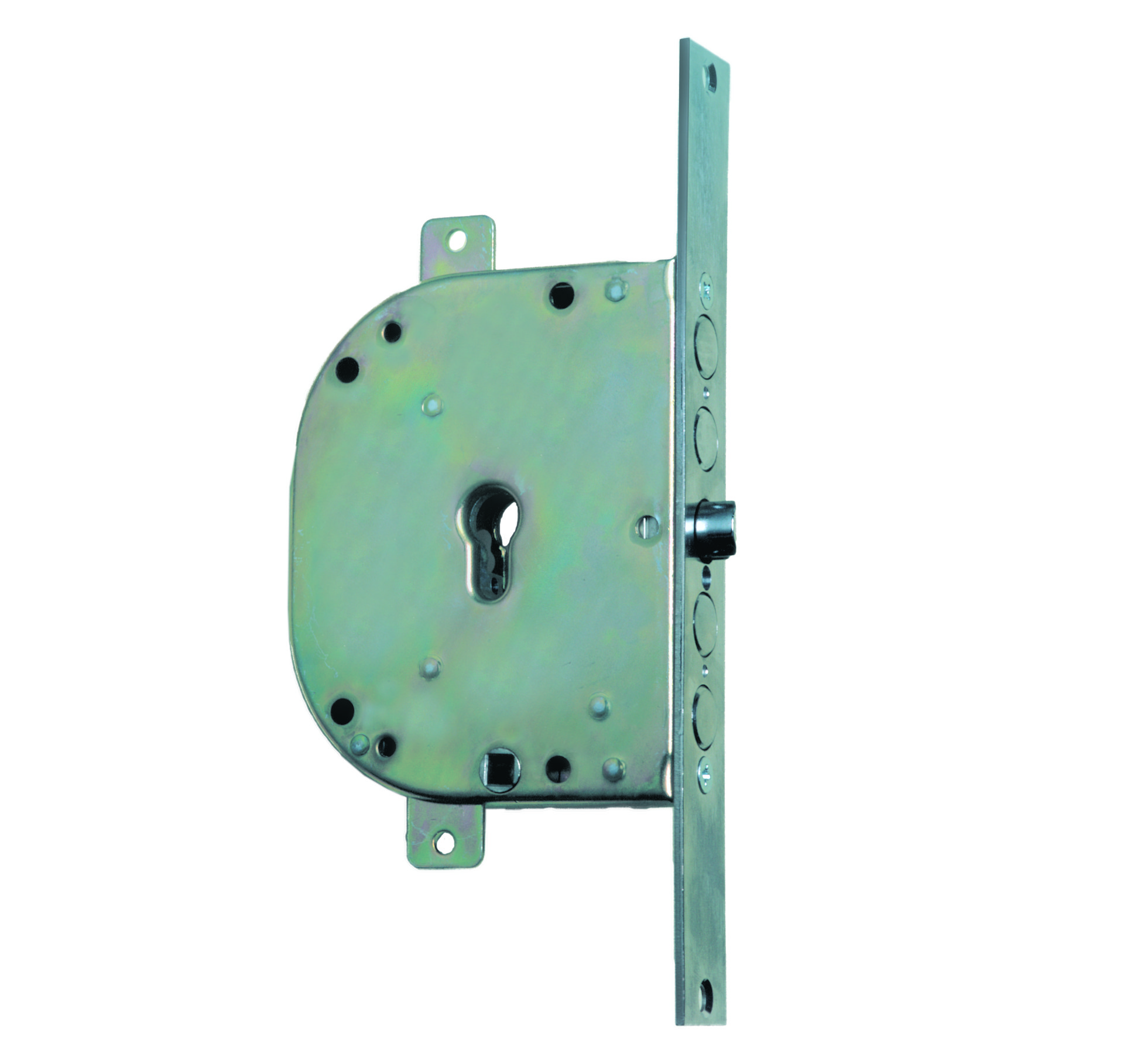 Cilindro a profilo europeo, chiusura triplice, scrocco comandato dalla chiave e dal quadro maniglia. 4 catenacci, corsa mm.29. Scatola zincata mm.164x130x32. Ad infilare.