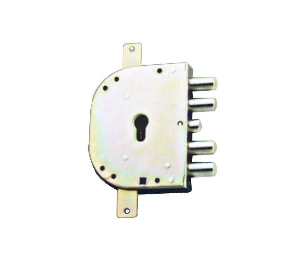 Cilindro a profilo europeo, chiusura triplice, scrocco comandato dalla chiave e dal quadro maniglia. 4 catenacci, corsa mm.29. Scatola zincata mm.164x130x32. A planare.