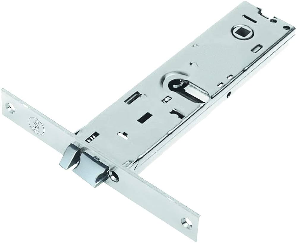 Scrocco e pistone di ricarica reversibili, frontale in acciaio inox, cassa in acciaio zincato, scrocco e pistone di ricambio nichelati, interasse maniglia/cilindro da 67 mm, foro per cilindro ovale, sistema di autocentraggio cilindro.