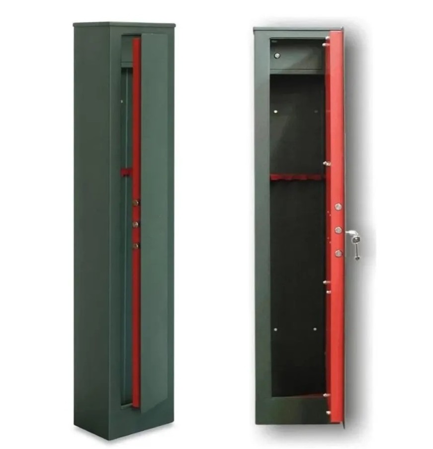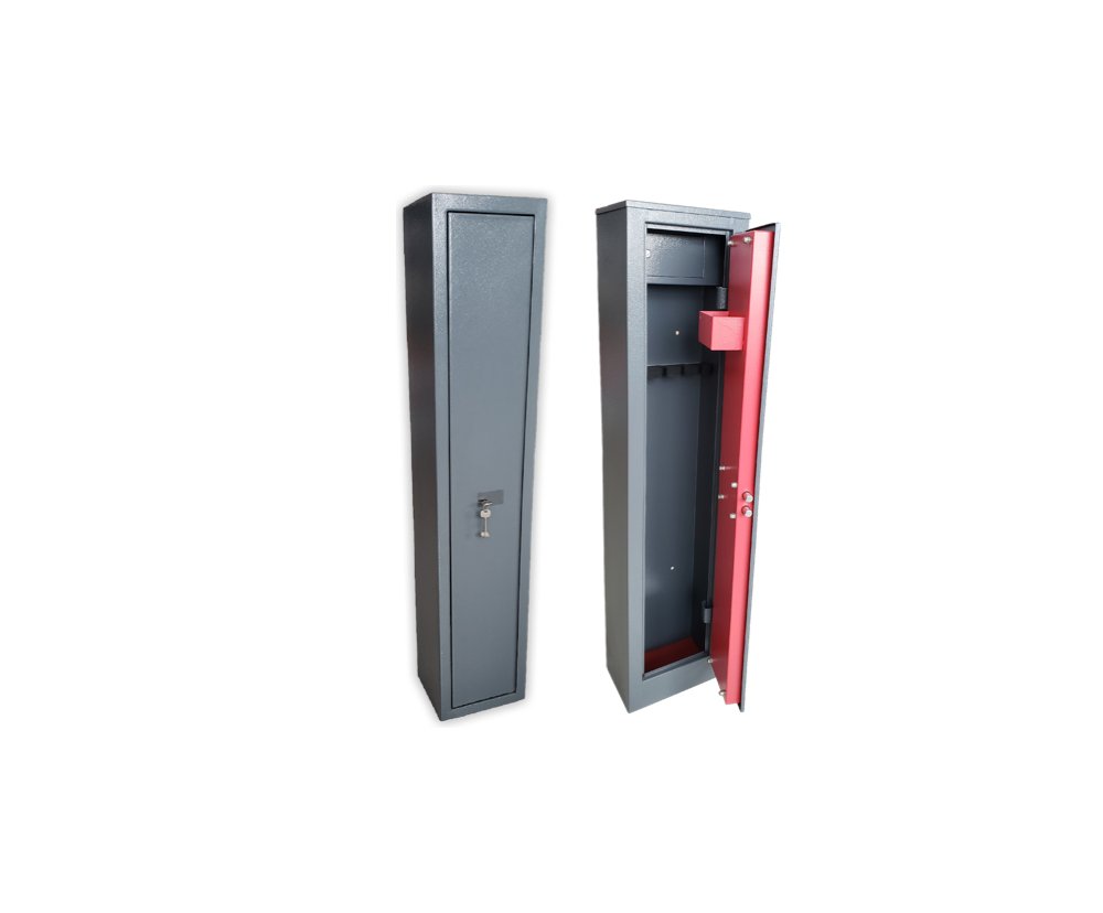 Struttura monoblocco in lamiera d'acciaio dello spessore di 1,5 mm. Porta spessore 2 mm. Spessore totale del battente 40 mm. Due catenacci laterali. Serratura di sicurezza con chiave a doppia mappa. Rastrelliera in gomma e tappetino sulla base. Tesoretto interno portamunizioni con serratura a cilindro. Dimensioni esterne ALP mm.1380x315x220.