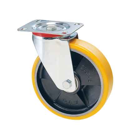 Supporto a piastra girevole in acciaio stampato rotante su doppia corona di sfere. Rivestimento in poliuretano AVOLAN 91 Shore A. Nucleo in ghisa meccanica di qualità, verniciata color nero. Mozzo su cuscinetti a sfere schermati assemblati con distanziale centrale.