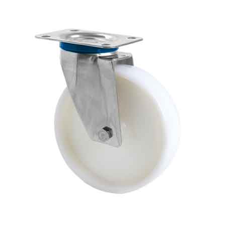 Supporto a piastra girevole in acciaio inox AISI 304 rotanti su doppia corona di sfere inox AISI 420. Anello parapolvere sul giro di sfere. Rivestimento in poliammide 6.