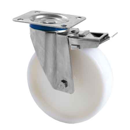 Supporto a piastra girevole in acciaio inox AISI 304 rotanti su doppia corona di sfere inox AISI 420 con freno. Anello parapolvere sul giro di sfere. Rivestimento in poliammide 6.