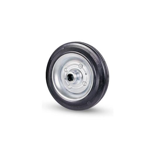 Foro passante. Rivestimento in gomma piena, flange in acciaio stampato zinco-cromato, mozzo su gabbia a rulli.