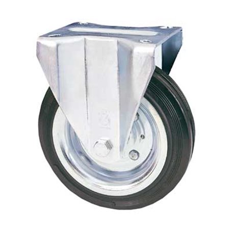 Supporto a piastra fissa in acciaio stampato. Rivestimento in gomma piena, flange in acciaio stampato zinco-cromato, mozzo su gabbia a rulli.