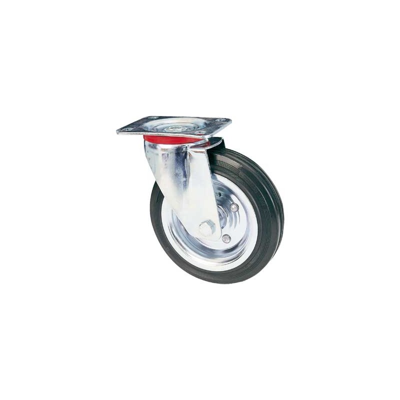 Supporto a piastra girevole in acciaio stampato rotante su doppia corona di sfere. Rivestimento in gomma piena, flange in acciaio stampato zinco-cromato, mozzo su gabbia a rulli.