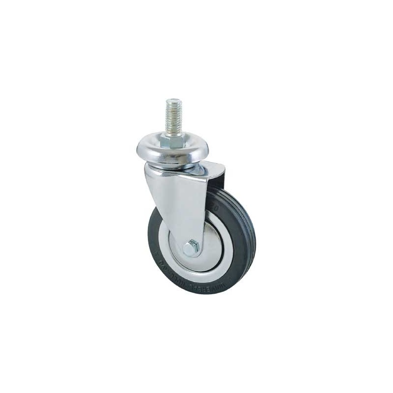 Supporto a perno filettato girevole in acciaio rotante su corona di sfere. Rivestimento in gomma con parafili e flange in acciaio stampato, rotante su cuscinetti a sfera.