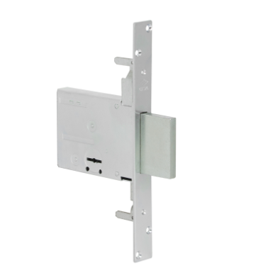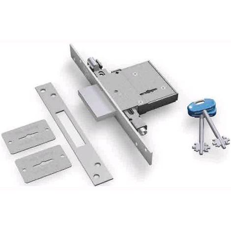 Tre punti di chiusura. Scatola e frontale con rivestimento in zinco. Catenaccio in acciaio con rivestimento in zinco. Ambidestra. 4 mandate. Frontale 25 mm.