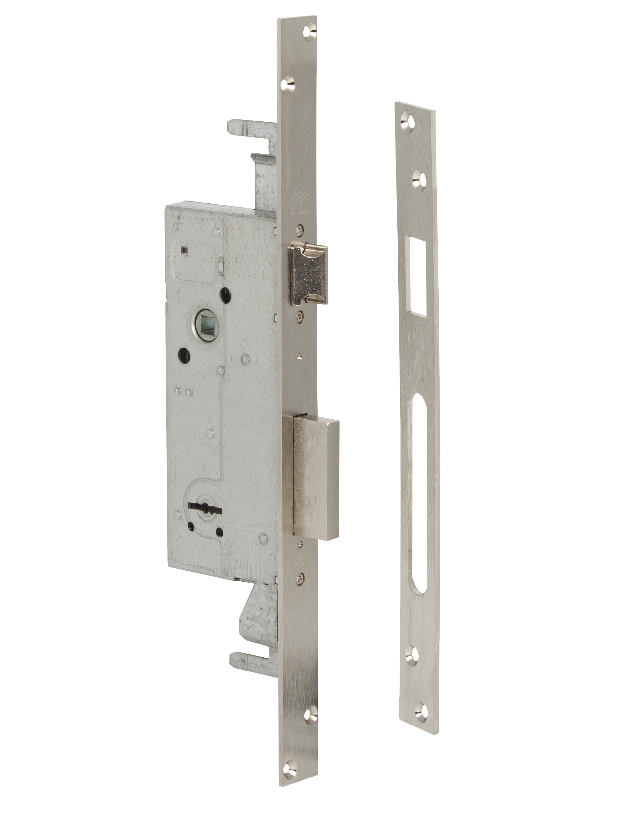 2 Mandate. Scatola in acciaio con rivestimento in zinco. Frontale e contropiastra in acciaio nichelato. Scrocco reversibile piatto ad invito nichelato. Catenaccio in acciaio nichelato. Predisposizione per le chiusure supplementari. Interasse 85 mm. Frontale 25 mm. In dotazione: Contropiastra, Copritoppa interno ed esterno, Viti di fissaggio, Due piastrini guida prolunghe. 3 Chiavi in dotazione.