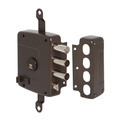 2 Mandate. Scatola e bocchetta in acciaio verniciate color bronzo antico metallizzato. Scrocco in acciaio nichelato. Catenaccio a 3 pistoni in acciaio nichelato. Tirante sul dorso. In dotazione: Bocchetta, Borchia interna e esterna, Viti fissaggio, Foglio instruzione. Cilindro non incluso.