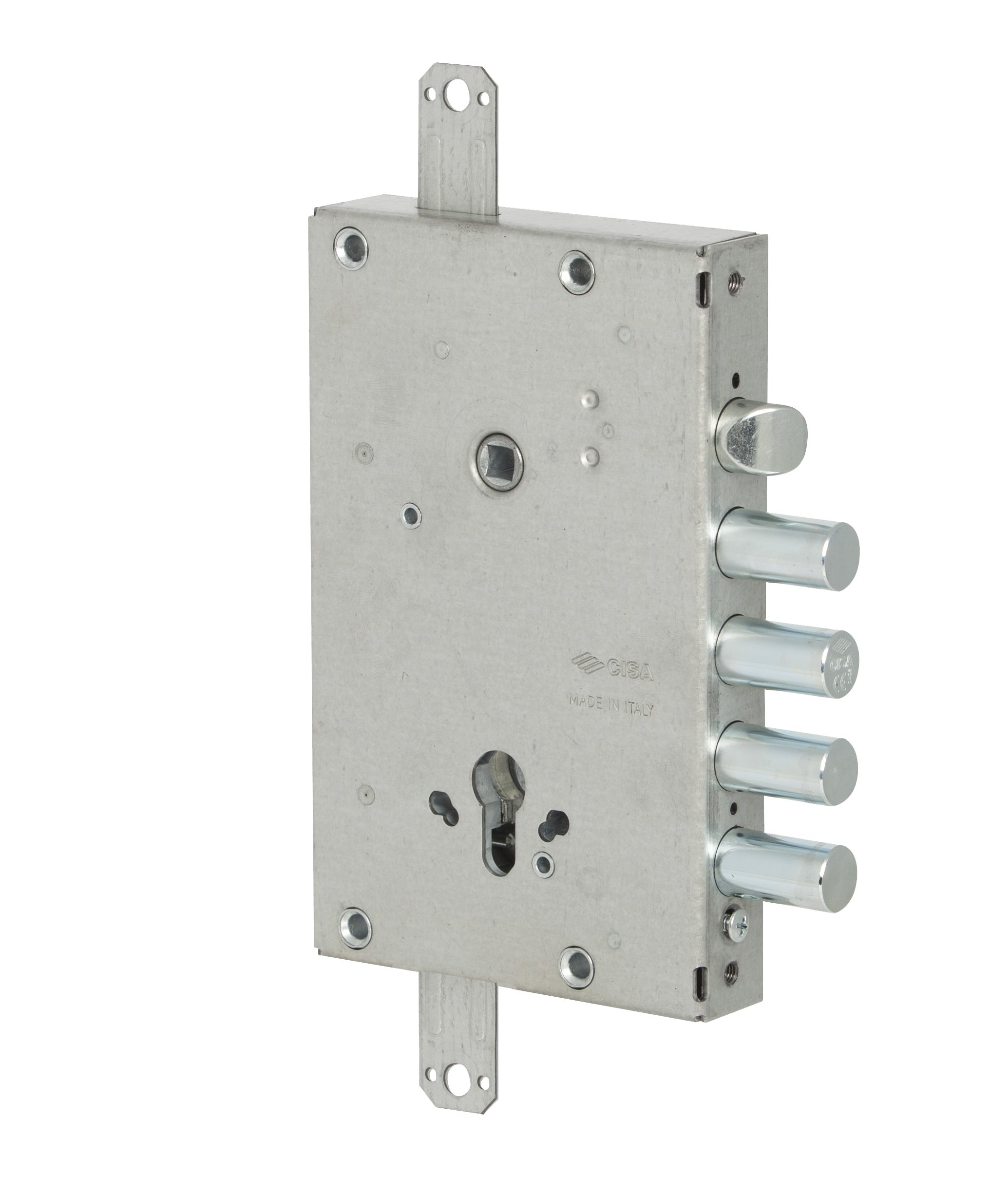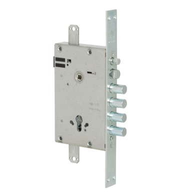 2 Mandate. Scatola in acciaio con rivestimento in zinco. Scrocco reversibile zincato alta resistenza. Catenacci in acciaio zincato alta resistenza. Serratura dotata di sistema di blocco in caso di estrazione del cilindro. Dispositivo di azionamento tramite sistema ad ingranaggi che riduce lo sforzo sulla chiave. Predisposizione per le chiusure supplementari. Sporgenza 3,5 mm.