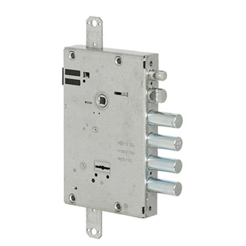 4 Mandate. 4 Catenacci. Scrocco autobloccante richiamabile elettrificamente . Tensione 12V ca CE. Predisposizione per le chiusure supplementari. Interasse dei catenacci mm 28. Interasse mm 85. Sporgenza mm 3,5. In dotazione 5 chiavi con 1 chiave cantiere.