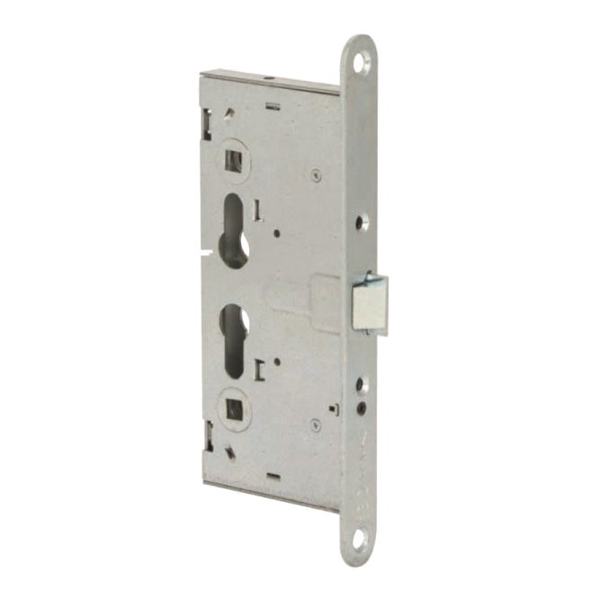 Interasse 72 mm. Frontale 24 mm. Scatola, Frontale e scrocco in acciaio con rivestimento in zinco. Quadro maniglia sdoppiato 9 mm. Solo scrocco. Testa in acciaio inox fin 20. Funzionamento: Interno (Con maniglione antipanico e/o chiave), Esterno (La chiave abilita e disabilita la maniglia e richiama lo scrocco; la maniglia richiama lo scrocco solo se è abilitata dalla chiave). Abbinabile a maniglioni antipanico serie 59600 e 59711.