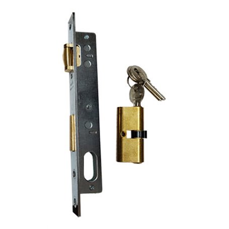 1 Mandata da 9 mm. Serratura da infilare per montanti a scatola aperta. Cilindro ovale (Non incluso). Frontale in acciaio cromato. Catenaccio prolungato 3 mm. Rullo regolabile. In dotazione viti per fissaggio cilindro.