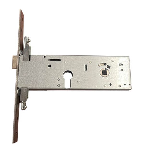 3 Mandate da 12 mm. Serratura modulare a cilindro profilo europeo (Non incluso). Chiusura triplice. Agganci aste a vite. Altezza cassa 64 mm. Frontale inox 240x22x3 mm. Scrocco separato reversibile e regolabile. Possibilità di sostituire lo scrocco con il rullo o con il tappo per chiusura solo catenaccio. In dotazione: 2 ghiere, coppia spessori sottofrontale, grano interno per fissaggio cilindro e viti di fissaggio.