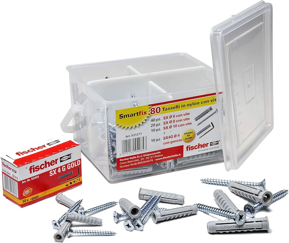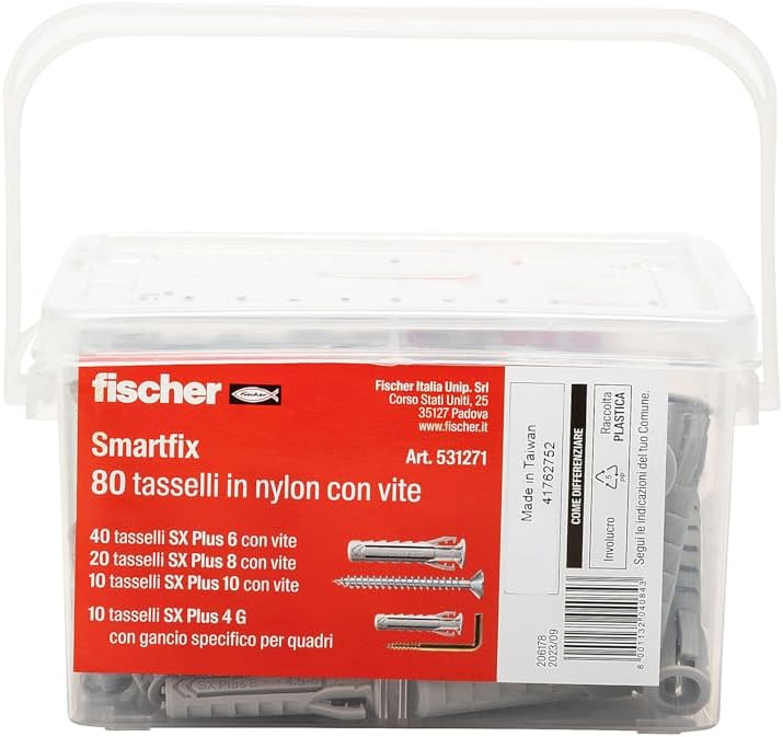 Compatto e pratico assortimento di tasselli che, grazie alle ridotte dimensioni, trovano facilmente posto in ogni casa. Trasparenti e resistenti permettono la scelta del fissaggio corretto a colpo d'occhio e la maniglia ne facilita il trasporto. La confezione comprende: SX 6S 40 pezzi, SX 8S 20 pezzi, SX 10S 10 pezzi, SX 4G 10 pezzi.
