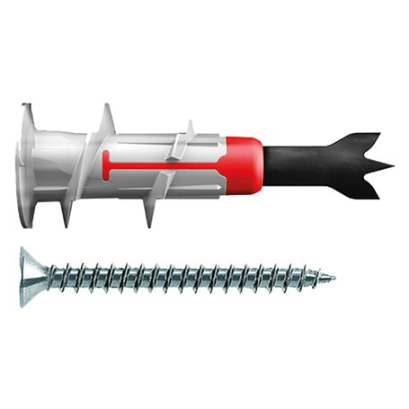 Tassello autoforante con tripla punta completo di vite per installazioni facili e veloci su pannelli e lastre di cartongesso. Combinazione bi-materiale, l'insieme di nylon e fibra di vetro genera un'espansione aggiuntiva e quindi una maggior tenuta. All'inserimento della vite, la punta viene espulsa cadendo nel vuoto retrostante. Lamelle anti-rotazione in modo da non muoversi in fase di installazione della vite.