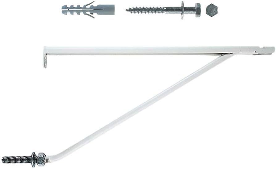 In acciaio verniciato a caldo. Composto da: mensola struttura a U, puntone di sostegno, tassello nylon Ø 12x60 con vite T.E. e rosetta, dado M12 con rosetta.