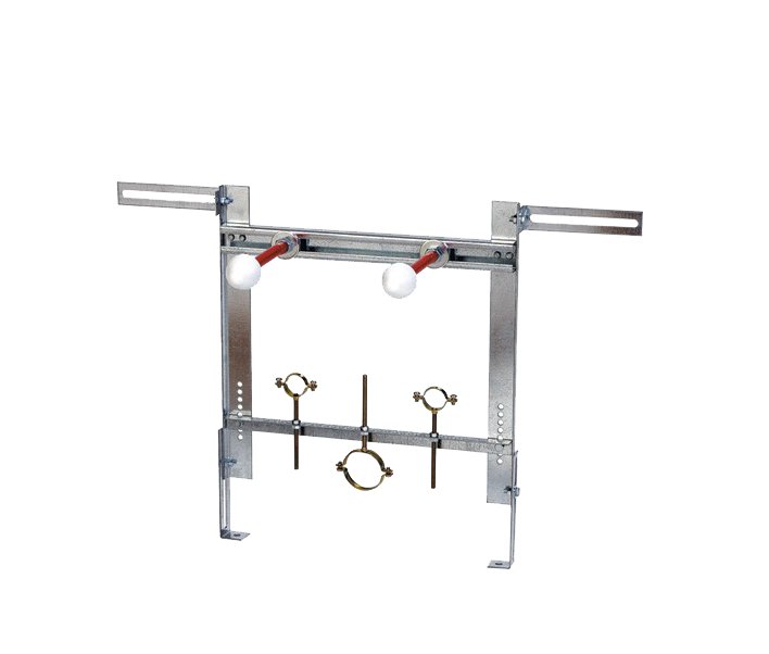 In acciaio zincato a caldo. Per lavabi con interasse 330 mm. Staffe utilizzabili come zanche. Completo di collari per il collegamento dell'adduzione idrica e dello scarico. Testato a 150 Kg secondo UNI EN 14688.