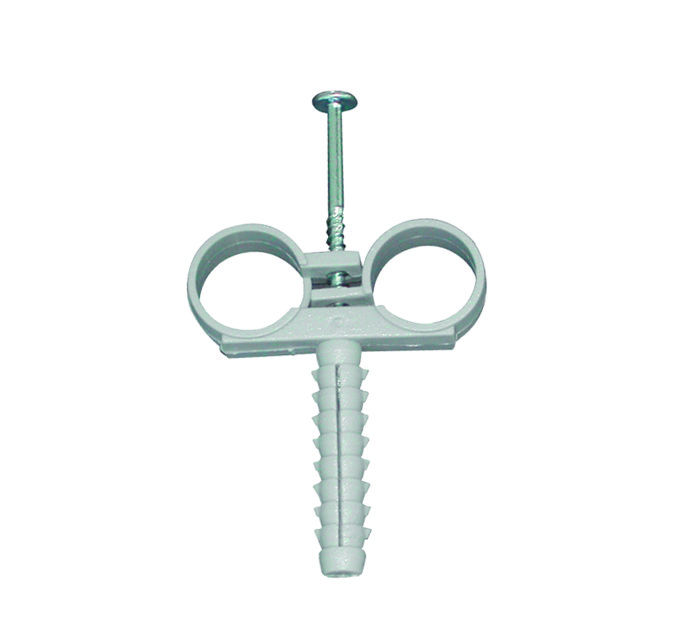 In nylon. Munito di tassello e vite di fissaggio, sono adatti al fissaggio di tubi leggeri in PVC, alluminio, ferro e rame su calcestruzzo mattoni pieni, mattoni forati e pietra naturale.