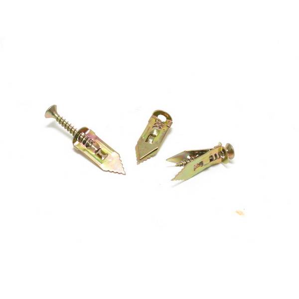 In acciaio. Specifico per fissaggi su pareti e controsoffitti in cartongesso. Tenuta massima garantita a taglio 30kg. Tenuta massima garantita a soffitto 3/5 kg . Tassello a percussione da inserire sulla lastra con un normale martello. Se rimosso dalla lastra provoca solo una piccola fessura.